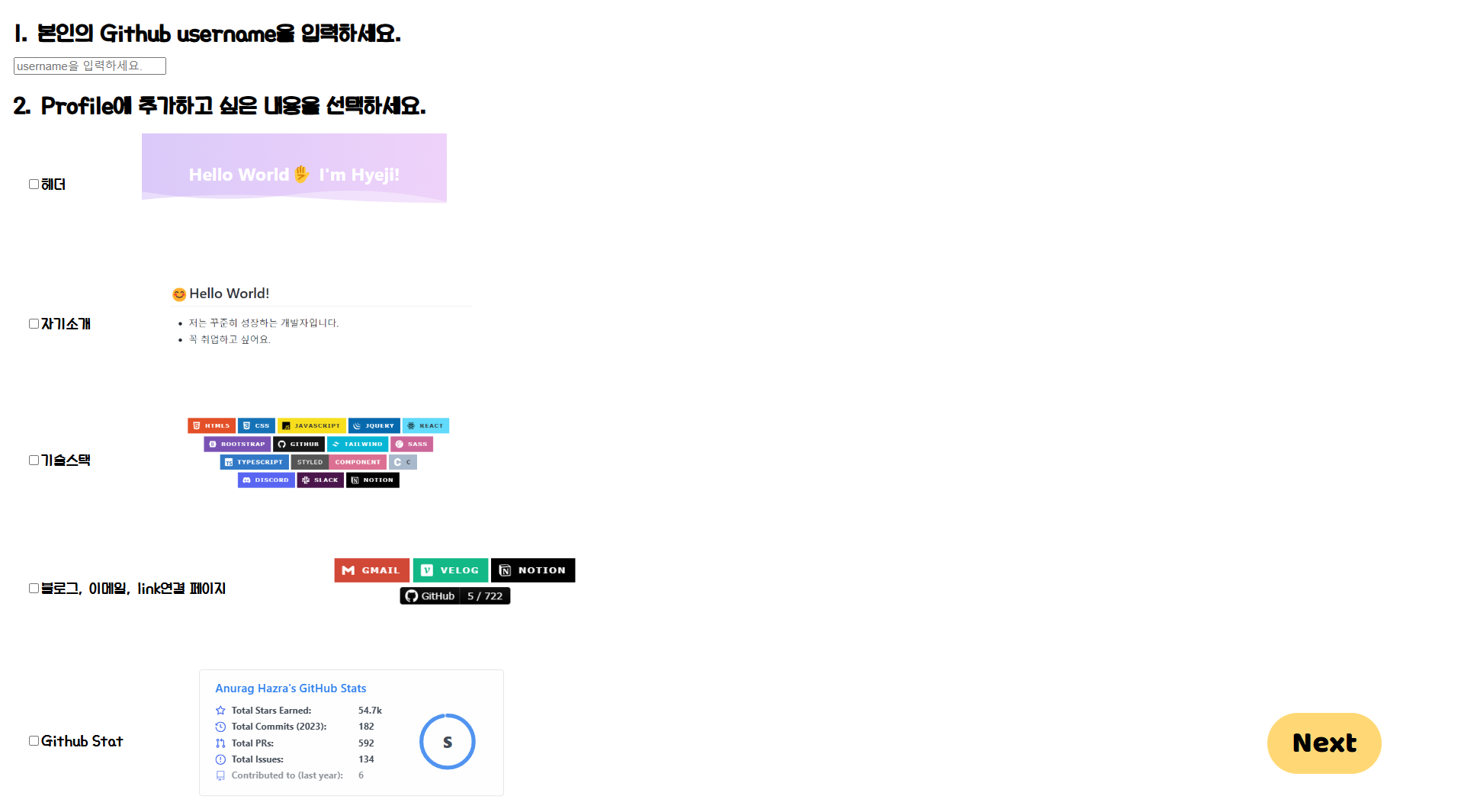 원하는 요소를 선택하고 입력하면 자동으로 코드를 생성해주는 사이트도 있어 README를 더욱 쉽게 완성할 수 있다.
